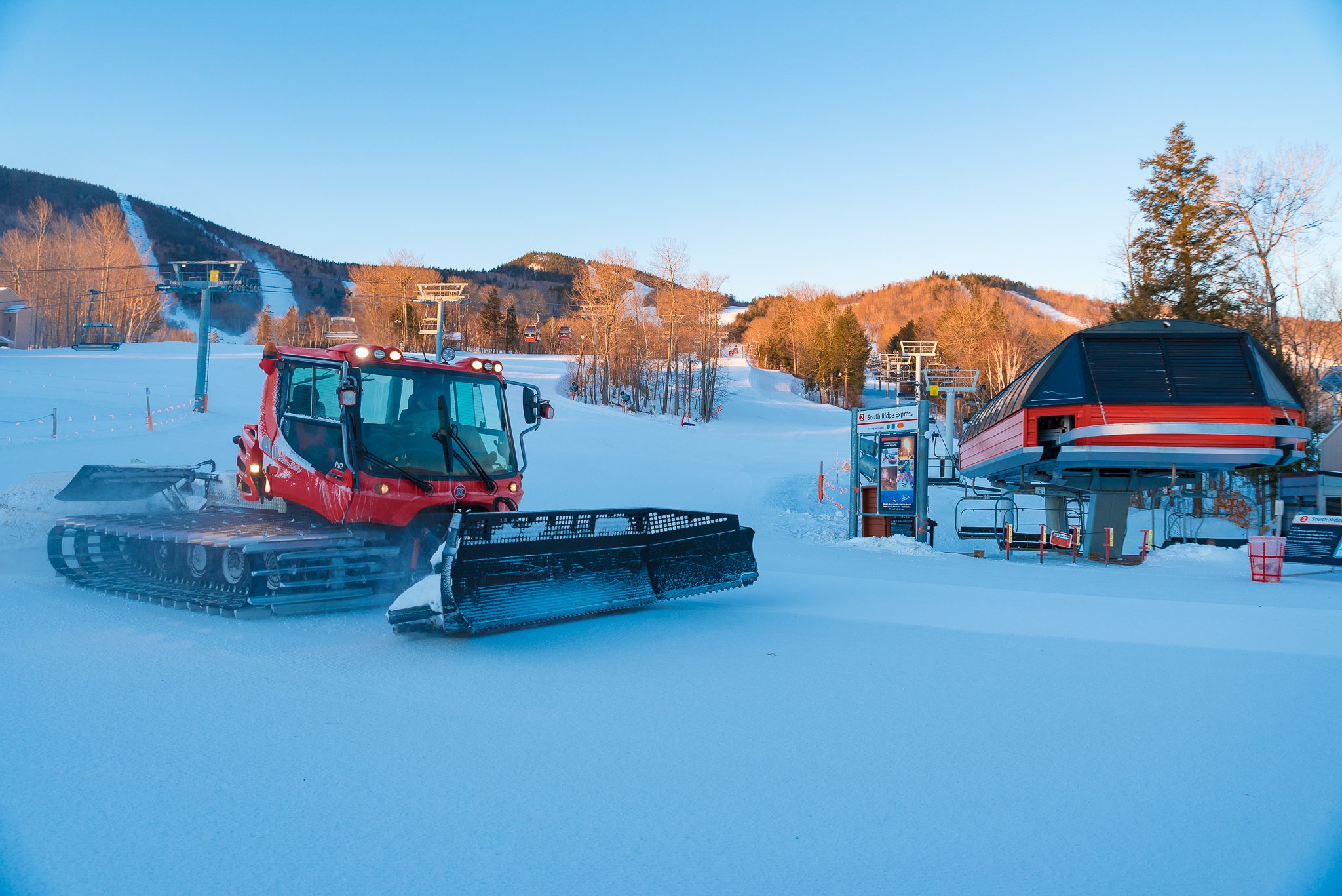Snow making was in progress along the bottom and top of the Barker Mountain lift. Sunday Punch was mostly boilerplate, the section just below the Locke Mountain mid station was especially icy. Ecstasy, Jungle Road, Cascades, and Wildfire were good. Monday Mourning was closed for race training. Top Gun was open but had active snow-making. Right Stuff was boilerplate and icy also. Lazy River to Tourist Trap back to Barker skied well.